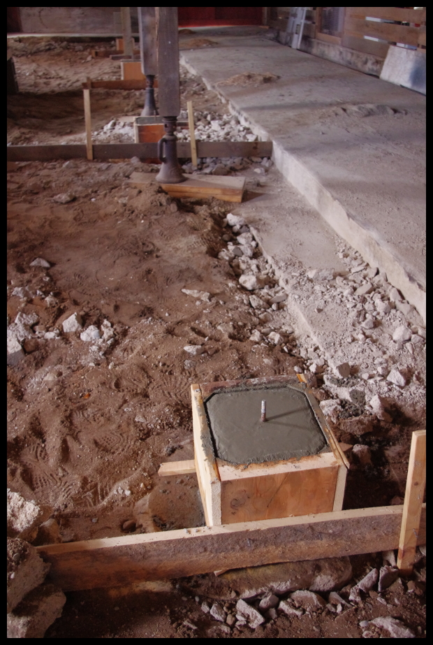 ast week, my grandpa helped me pour some new concrete footings for the replacement posts in the area where we removed the concrete trough. Luckily the original builders of the barn poured deep footings beneath the slab under the original posts, so we just had to tie in our added concrete to the existing. We did this by drilling holes into the old footings with a hammer drill, and placing large nails into them, with a few inches in the old concrete and a few in the new pour. In the top of each pour we placed an anchor bolt that raises two or three inches above the top of the footing. We will drill a corresponding hole in the base of the posts that is a few bit sizes larger than the bolt so we can slide the post over it, preventing the post from moving. We secured the form for the act of filling it with concrete, by nailing it to the longer board you see, and nailing that to wooden stakes we drove into the dirt. We used load-bearing, structural grade cement and though the bag said to wait 3 days before building onto it, my grandpa said we must wait 10 days.