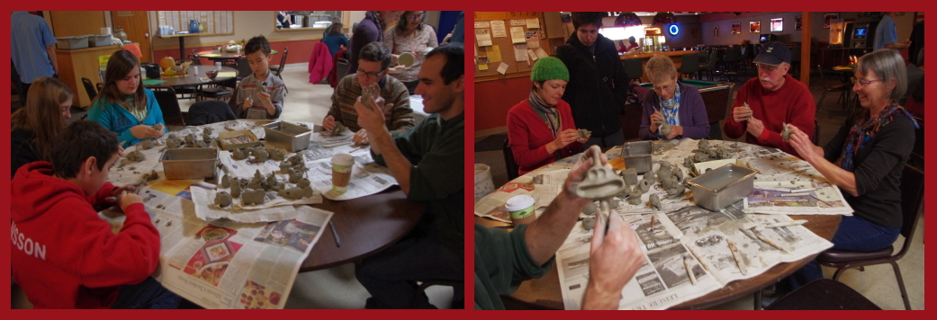 We brought a big tub of clay that we made from the deposit at the farm to the bouja and are asking people to sit and make some with us. Besides human-like faces on the beads, we’ve got a menagerie of animal forms and faces so far, and even a few dragons and zombies:)