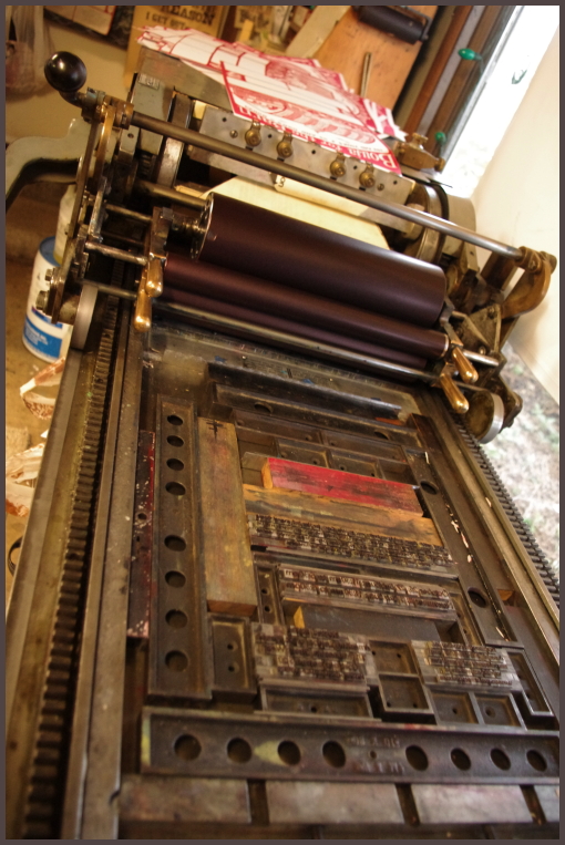 Her old presses sure make the job slick. At right you see the bed of the press with the type locked into place. And below, the finished poster.